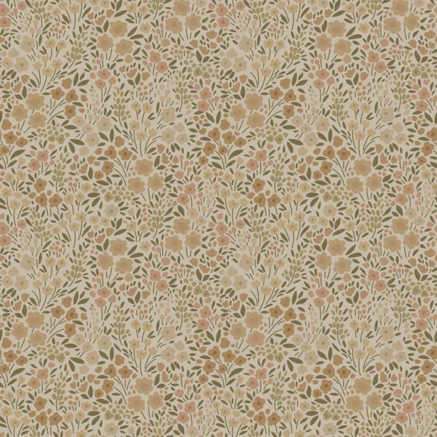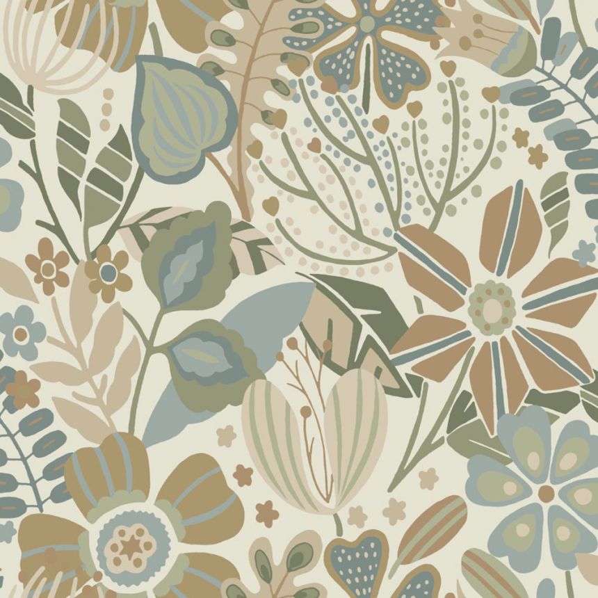 Glatte Vliestapete, florales Muster in Braun-, Beige-, Grau-, Grün- und Blautönen.