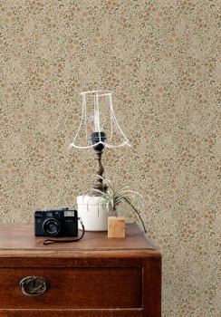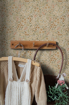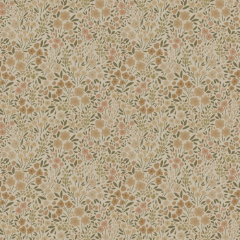 Beige glatte Vliestapete, Blumenmuster in Braun- und Beigetönen.