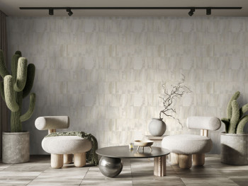 Luxuriöse geometrische Vliestapete mit Vinyloberfläche, effektvollem Wechsel plastischer Texturen, Elfenbein und Hellgrau.