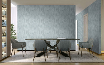 Luxuriöse geometrische Vliestapete mit Vinyloberfläche, effektvollem Wechsel plastischer Texturen, grau-blau halbglänzend.