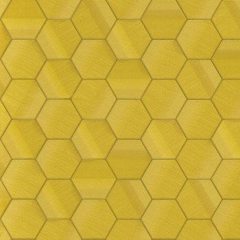 Luxuriöse, halbglänzende, safrangelbe, geometrische Vliestapete mit Vinyloberfläche. Goldfarbene Konturen, ausgeprägte Textur, Sechseckmuster.