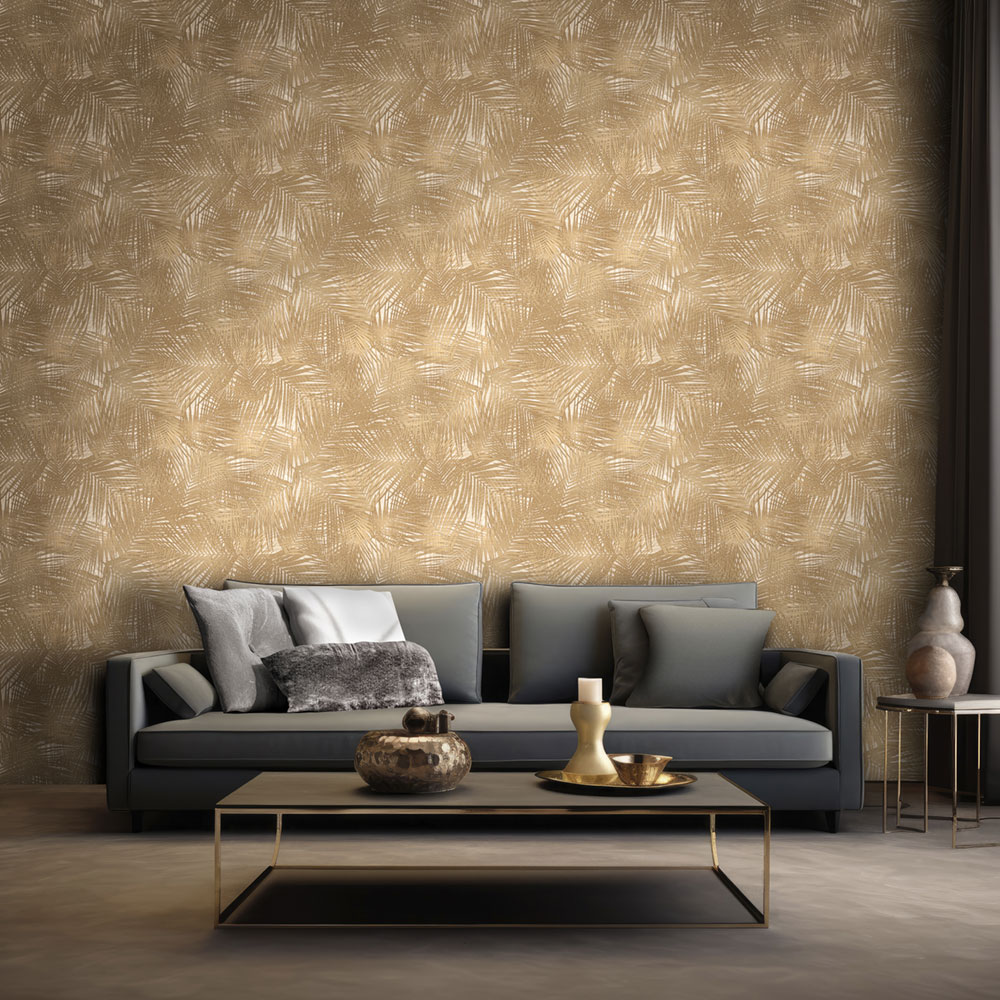 Luxuriöse Vliestapete mit Vinyloberfläche, braun-goldenes Palmenblatt-Motiv auf halbglänzendem beigem Hintergrund mit spektakulärer Verflechtung.