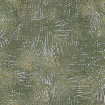 Luxuriöse Vliestapete mit Vinyloberfläche, Motiv aus grünen Palmblättern auf silbernem Hintergrund mit effektvoller Verflechtung.