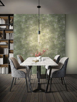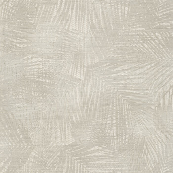 Luxuriöse Vliestapete mit Vinyloberfläche, Motiv aus cremefarbenen Palmblättern auf glänzendem Perlglanz-Hintergrund mit effektvoller Verflechtung.