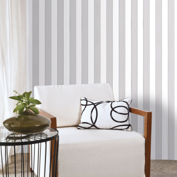 Vliestapete, grau-weiße Streifen, schmaler schwarzer Streifen.