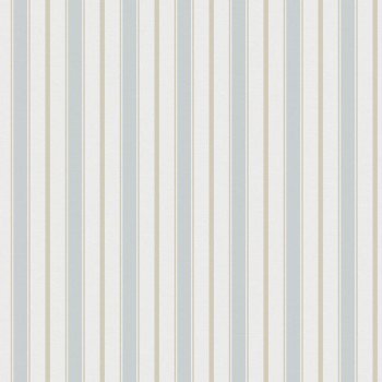 Weiße Vliestapete, Streifen in Blau- und Beigetönen.