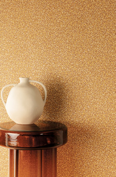 Zart geprägte Vliestapete, Steinterrasso in Ockertönen, ziegelroter Hintergrund.