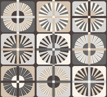 Sanft geprägte Vliestapete, grafisches Retromuster in Creme-, Grau-, Schwarz-, Silber- und Beigetönen.