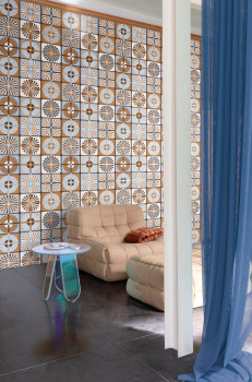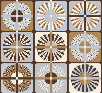 Sanft geprägte Vliestapete, grafisches Retromuster in den Farbtönen Creme, Blau, Braun, Schwarz und Silber.