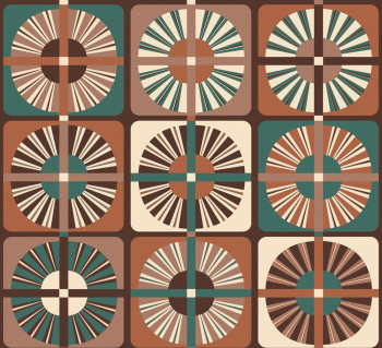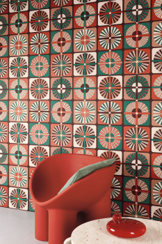 Sanft geprägte Vliestapete, grafisches Retromuster in den Farben Grün, Backstein, Beige, Braun und Schwarz.