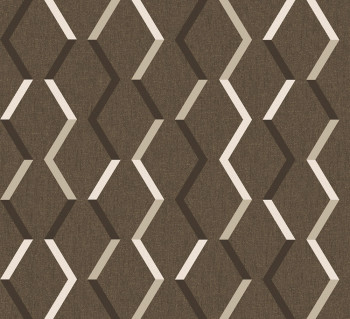 Vliestapete, grobe Stoffstruktur, Zickzack-Muster, Schattierungen von Dunkelbraun, Beige und Schwarz, bronzefarbene Details.