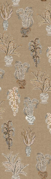 Vliestapete, gröbere Stoffstruktur, Motive von Pflanzen in Vasen, Braun-, Beige-, Rosa- und Grautöne.