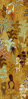 Vliestapete, grobe Stoffstruktur, Pflanzenmotive, Ocker-, Braun- und Grüntöne.