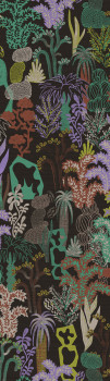 Vliestapete, grobe Stoffstruktur, Pflanzenmotive, Schwarz-, Grün-, Lila-, Braun- und Grautöne.