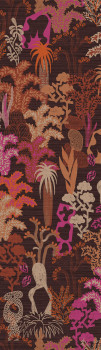 Vliestapete, grobe Stoffstruktur, Pflanzenmotive, Braun-, Rosa- und Orangetöne.