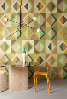 Geometrische Vliestapete, grobe Stoffstruktur, Grün-, Ocker-, Braun- und Beigetöne.