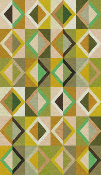 Geometrische Vliestapete, grobe Stoffstruktur, Grün-, Ocker-, Braun- und Beigetöne.