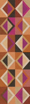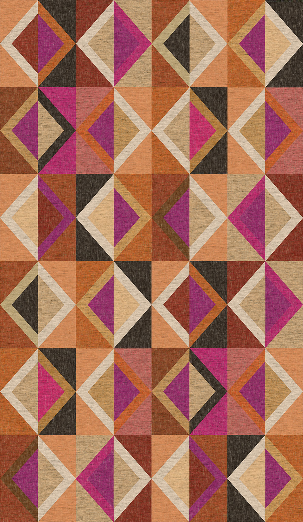 Geometrische Vliestapete, grobe Stoffstruktur, Braun-, Lila-, Orange- und Beigetöne.