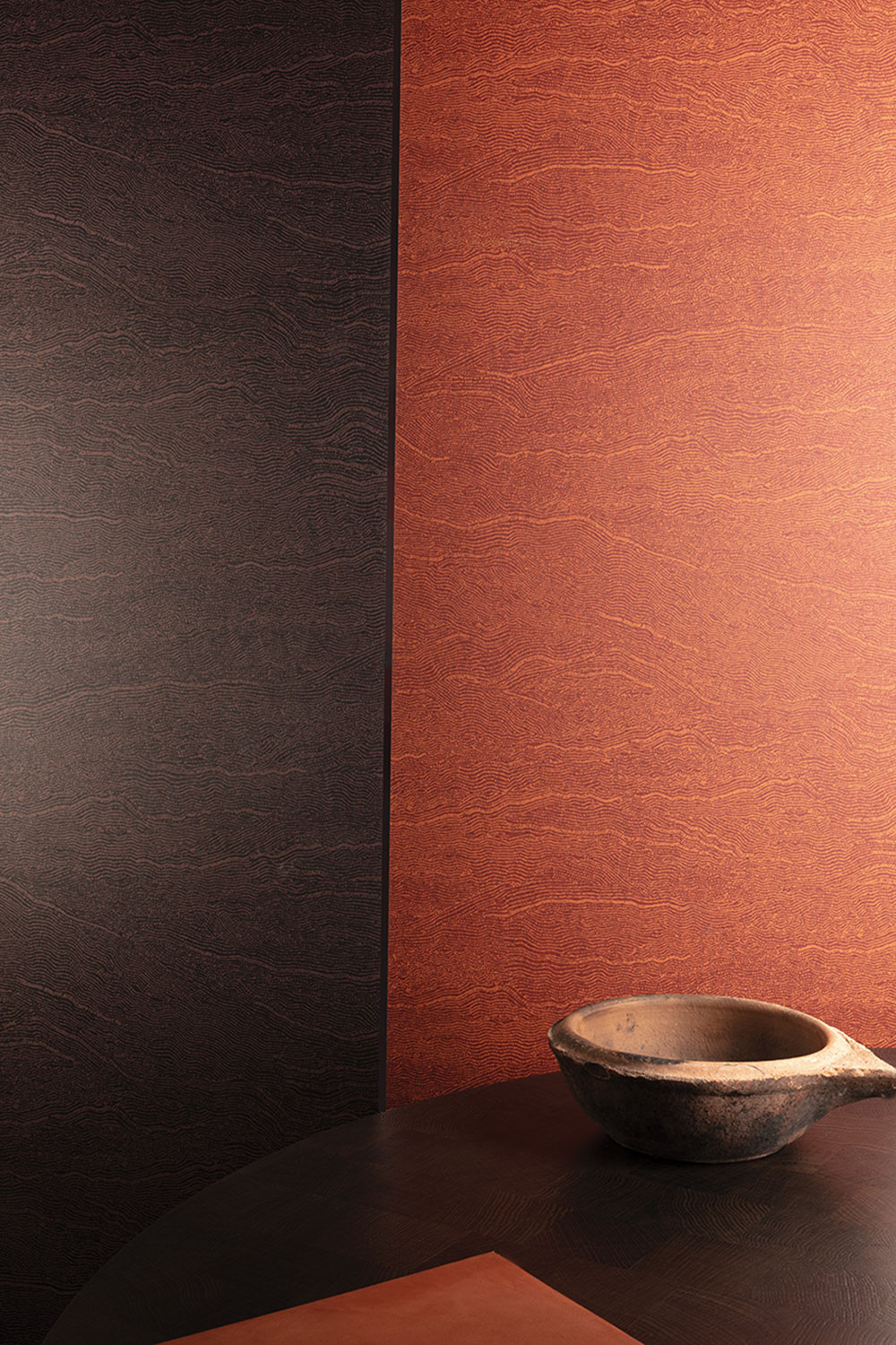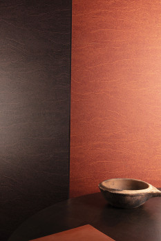 Vliestapete mit dezent geprägtem Wellenmuster in Braun-Rot-Tönen.