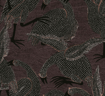 Vliestapete, geprägtes Perlenmuster, in Schwarz-, Metallic-Beige- und Bronzetönen, auf Terrakotta-Grund.
