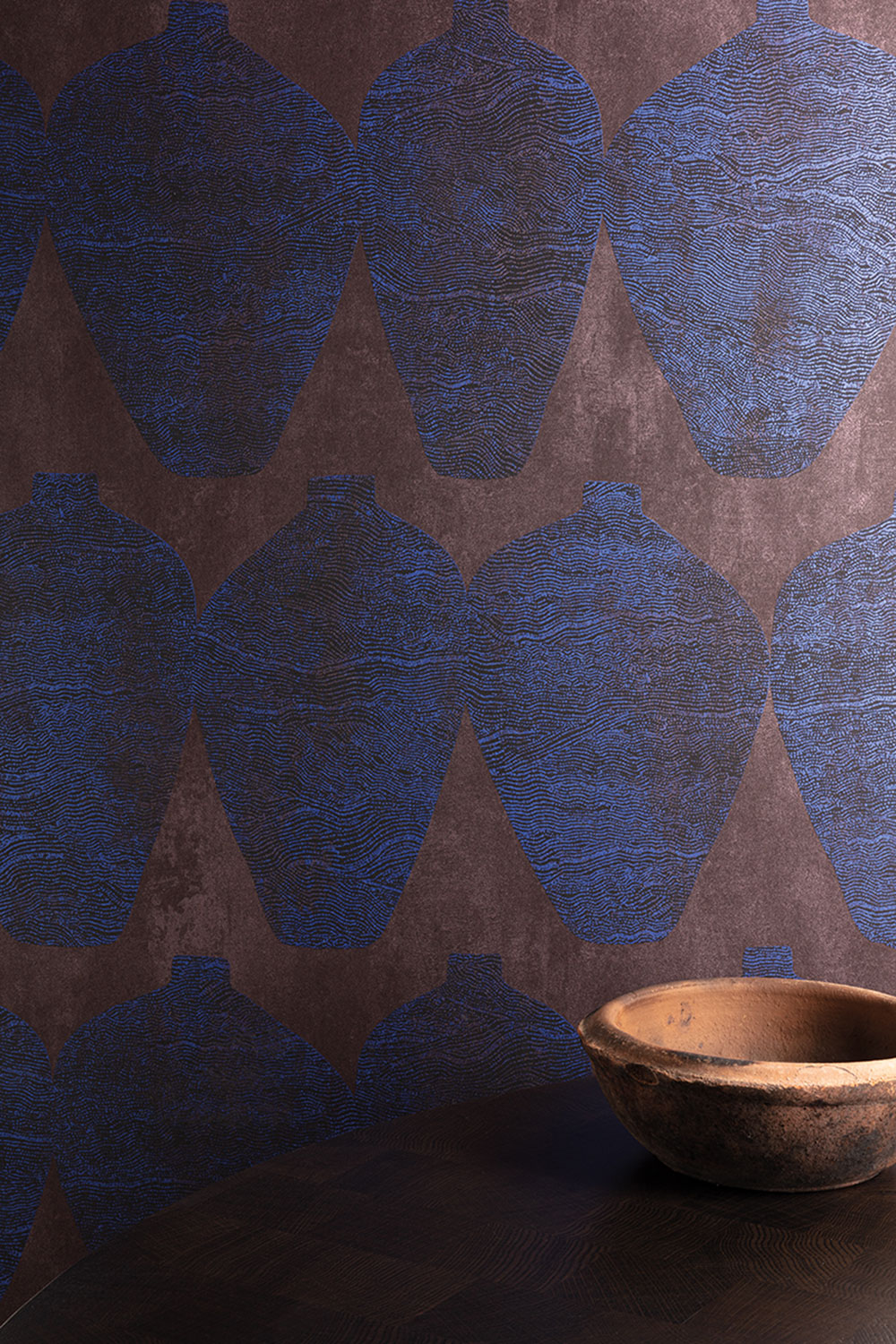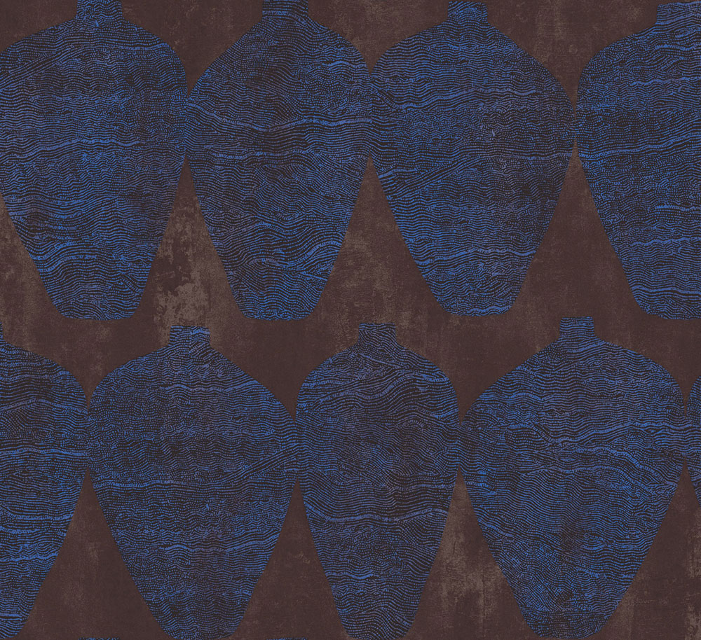 Vliestapete, zart geprägtes Vasenmuster in Schwarz-, Metallicblau- und Bronzetönen, halbglänzender brauner Hintergrund.