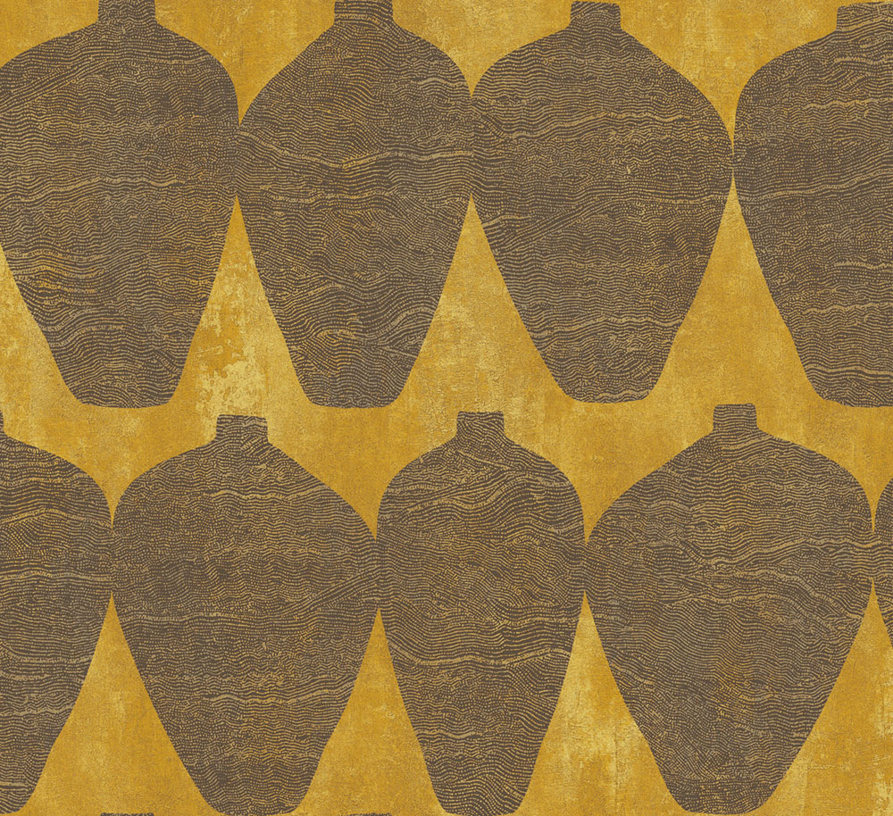 Vliestapete, zart geprägtes Vasenmuster in Braun- und Goldtönen, halbglänzender safrangelber Hintergrund.