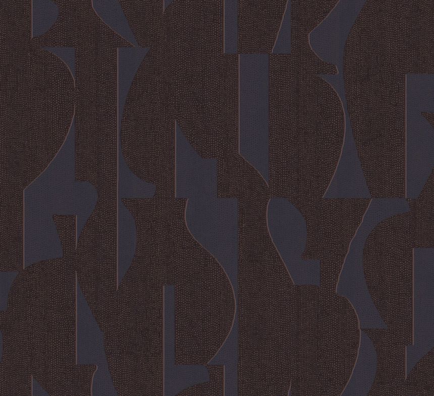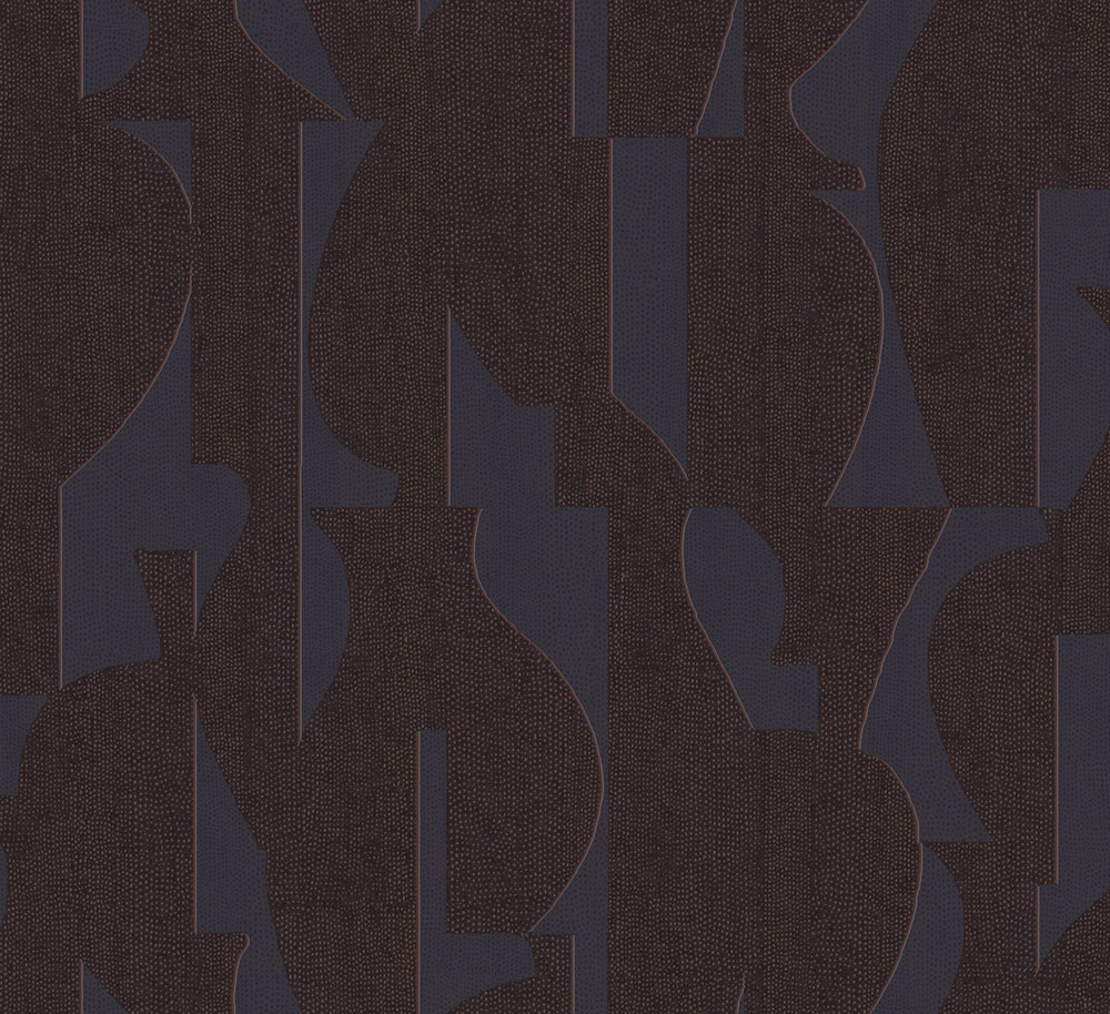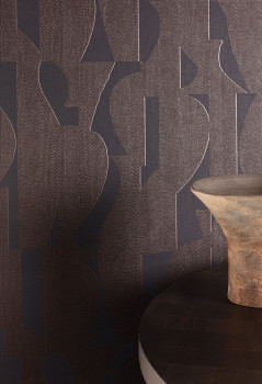 Vliestapete, zart geprägtes, halbglänzendes, geometrisches Muster in Brauntönen auf schwarzem Hintergrund.