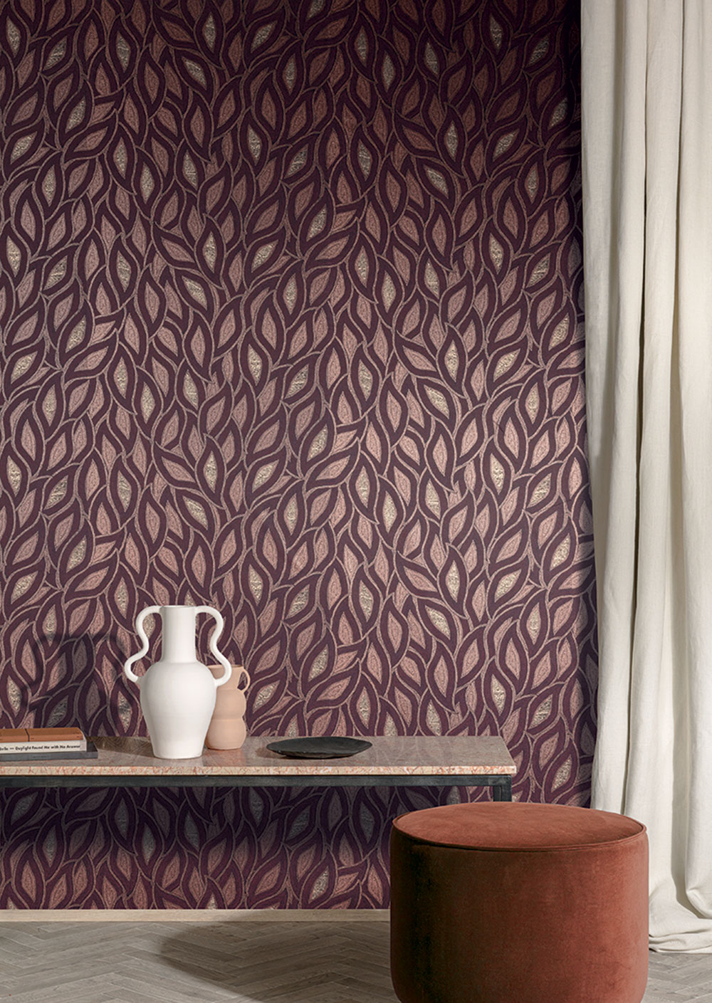 Vliestapete mit zart geprägtem, gestreiftem Blattmuster in Burgunder-, Gold- und Bronzetönen.