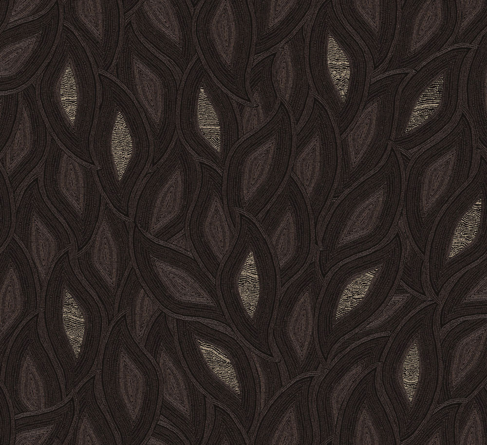 Vliestapete, zart geprägtes gestreiftes Blattmuster in Schwarz-, Metallic- und Goldtönen.