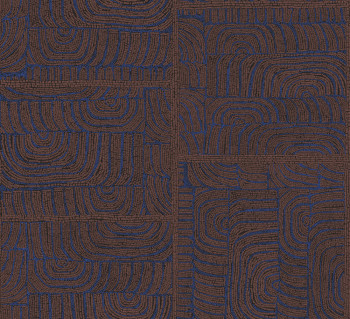 Vliestapete mit dezent geprägtem Ethno-Muster in Braun- und Metallic-Blautönen.