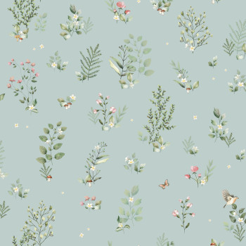 Türkise Vliestapete mit Pflanzen und Vögeln, 973-2, Mika, ICH Wallcoverings