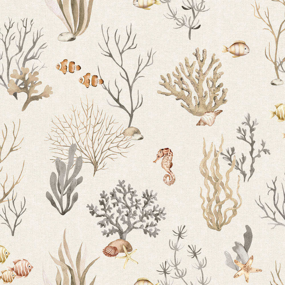 Beige Vliestapete, Motive von Meerestieren und Pflanzen.