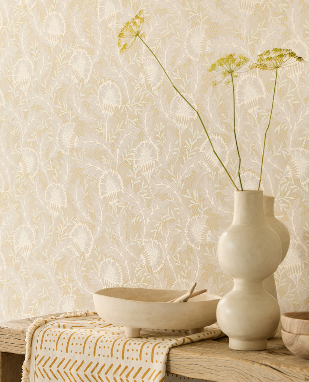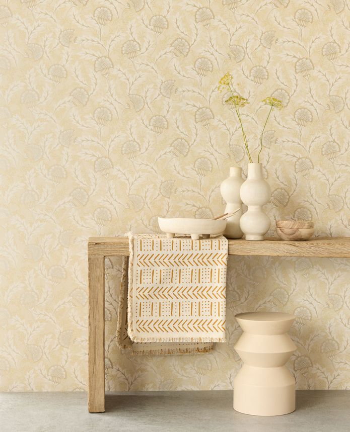 Cremefarbene Vliestapete, unkonventionelles goldenes Blumenmuster, inspiriert von afrikanischem Batik.