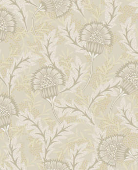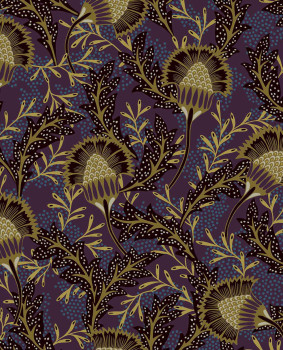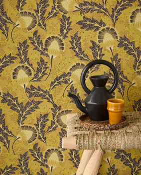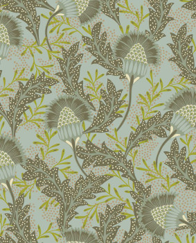 Grüne Vliestapete, unkonventionelles, teilweise metallisches, florales Muster inspiriert von afrikanischem Batik.