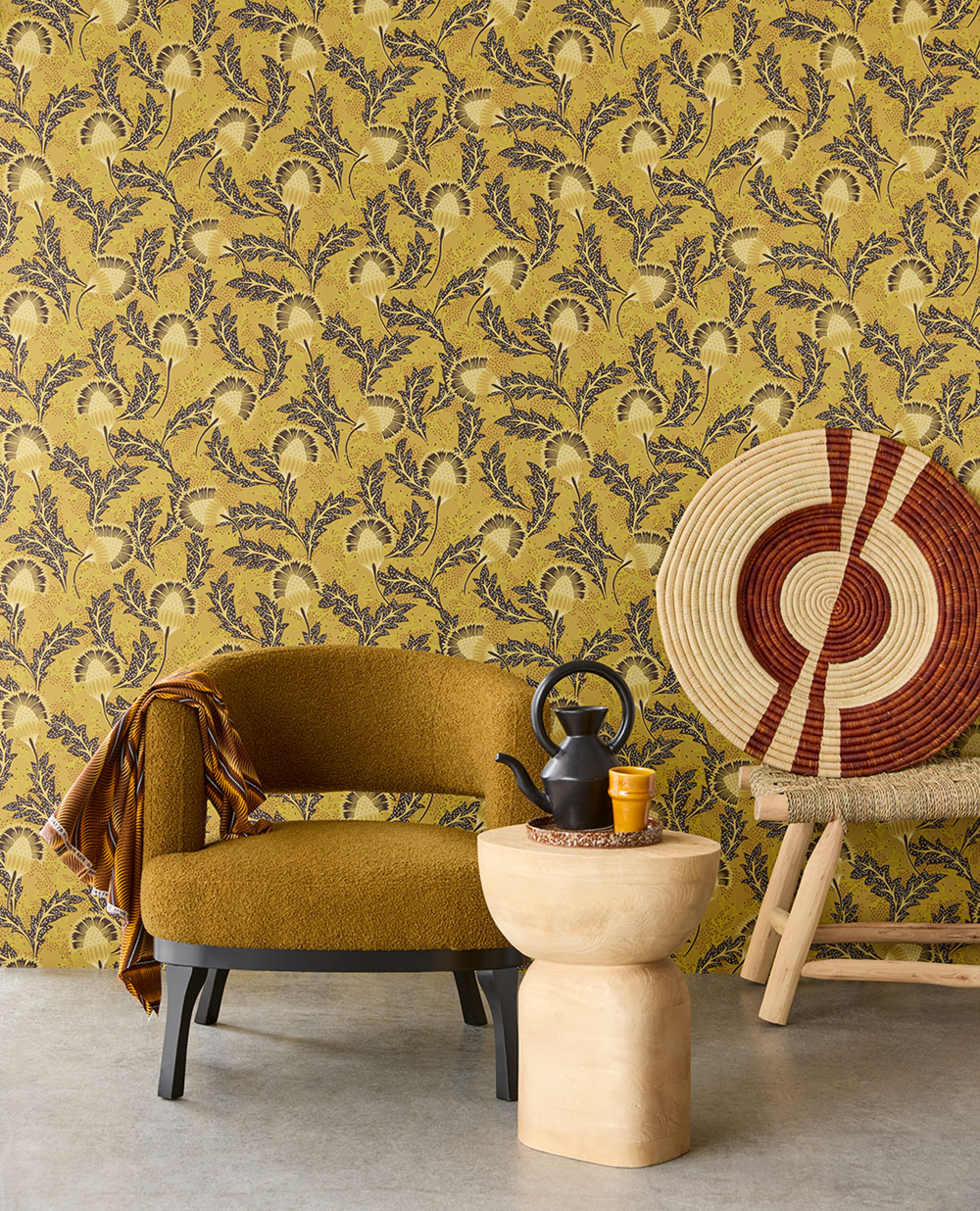 Ockerfarbene Vliestapete, unkonventionelles Blumenmuster inspiriert von afrikanischem Batik.