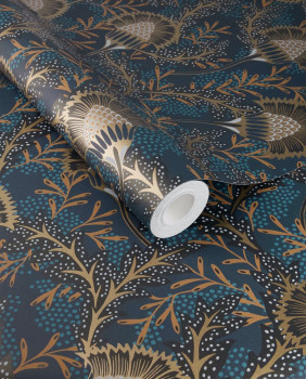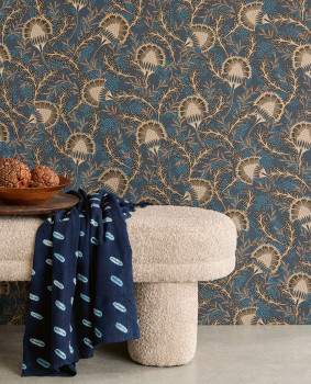Blaue Vliestapete, unkonventionelles Blumenmuster inspiriert von afrikanischem Batik, bronzefarbene Blumen und Blattteile, andere Farben – Schwarz, Braun.