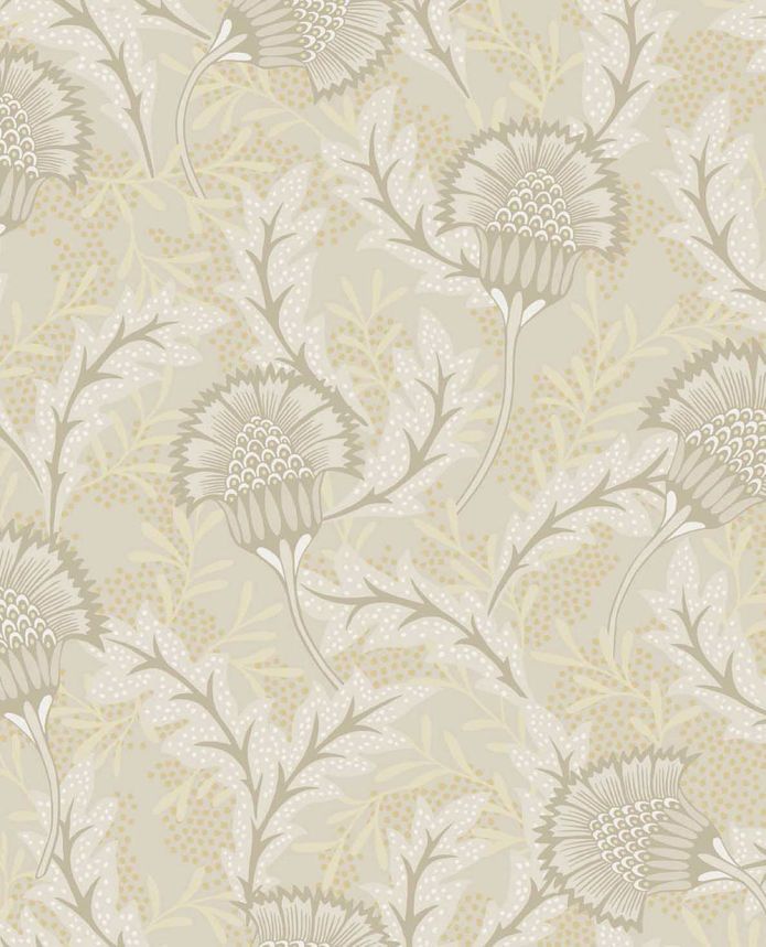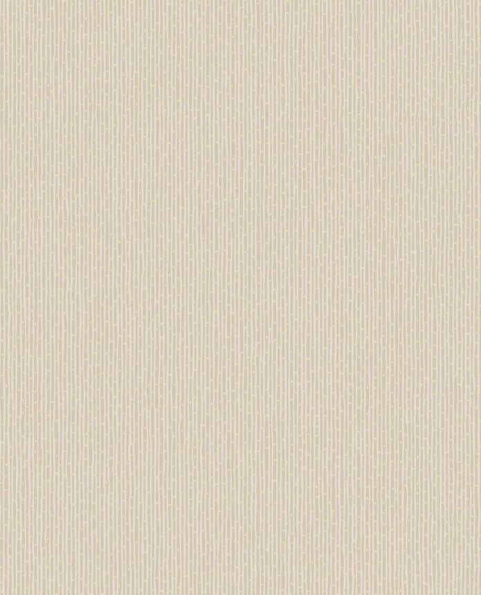 Vliestapete, unregelmäßige Streifen in Creme- und Beigetönen, kleine goldene Tupfen.