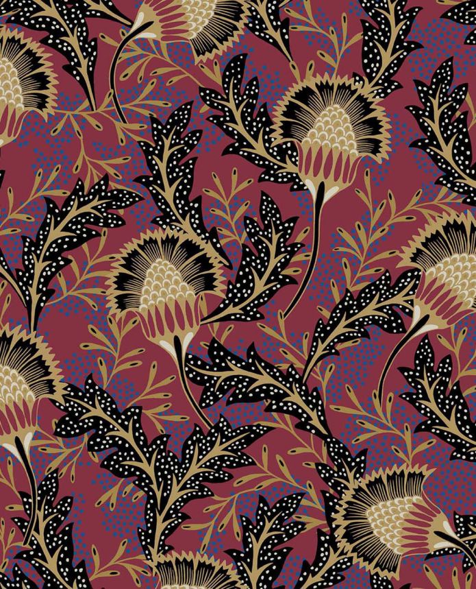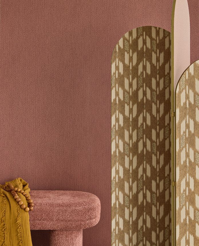 Vliestapete, unregelmäßige Streifen in Burgundertönen, kleine goldene Tupfen.