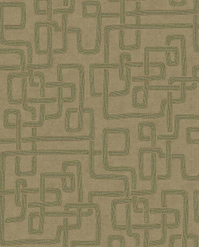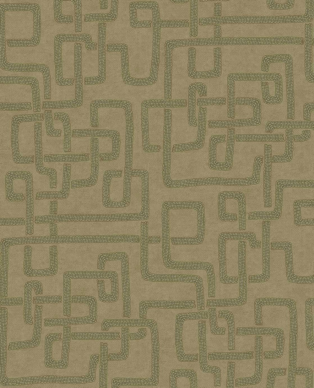 Sanft geprägte Vliestapete, Stoffoptik, Grün-/Khakitöne, im Muster mit metallischen Akzenten.