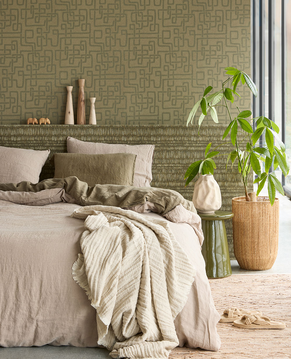 Mit Solange holen Sie sich die Lebensfreude traditioneller afrikanischer Batikmuster direkt an Ihre Wände. Oder entdecken Sie den modernen Nomadenstil mit ikat-inspirierten Designs. Wie wäre es mit einem eleganten Zickzack-Muster mit feinen metallischen Akzenten – eine Hommage an die prachtvollen Kuba-Stoffe? Die Kollektion begeistert mit einer Farbpalette, die an natürliche Töne von Raffiabast und Batikteppichen erinnert – von lebhaften Farben bis zu gedeckten Erdtönen.