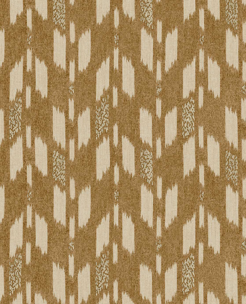 Sanft geprägte Vliestapete, Ikat-Stoffoptik, Braun- und Beigetöne.