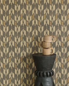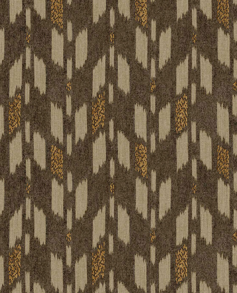 Sanft geprägte Vliestapete, Ikat-Stoffoptik, Dunkelbraun- und Braunbeigetöne.