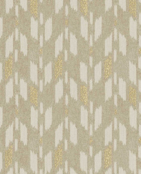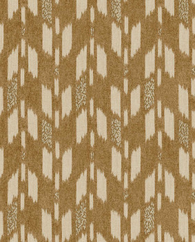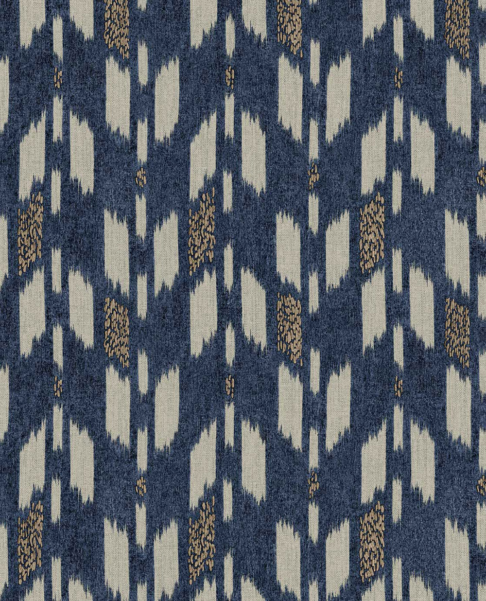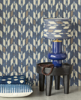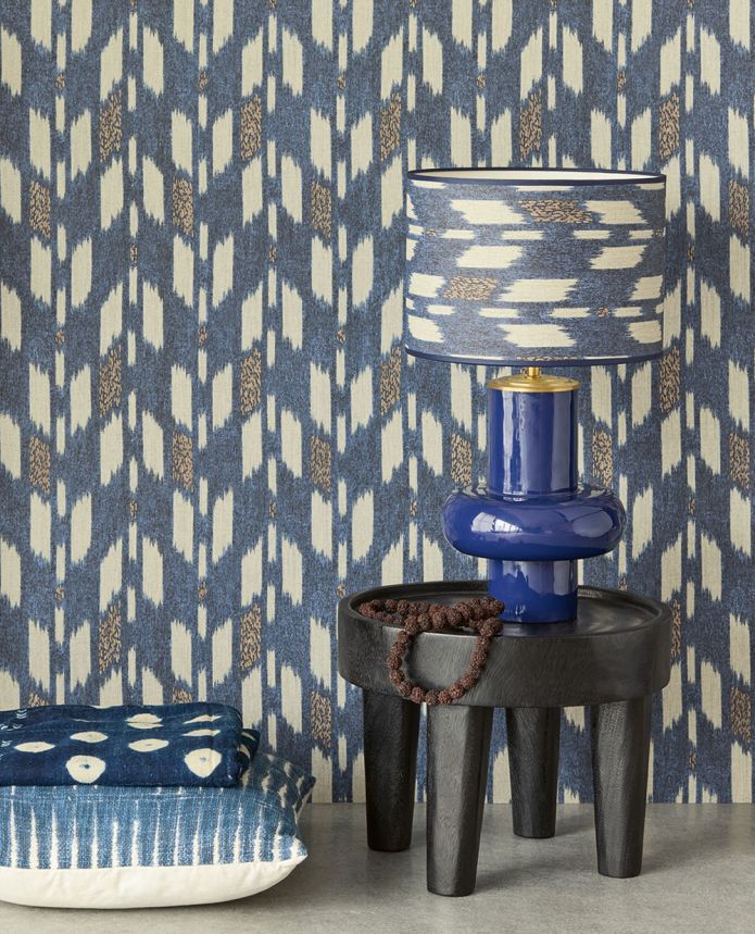 Sanft geprägte Vliestapete, Ikat-Stoffoptik, Dunkelblau-, Graubeige- und Brauntöne.