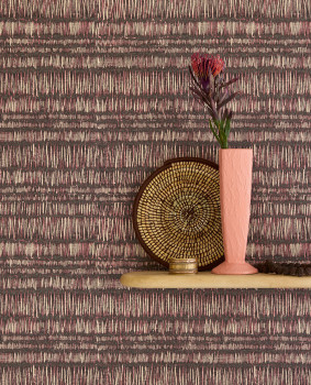 Vliestapete, Batik-Streifenmuster in Burgunder- und Beigetönen.