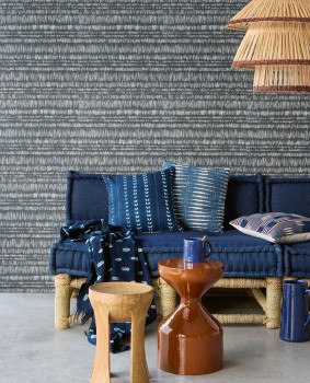 Vliestapete, Batik-Streifenmuster in Blau- und Grautönen.