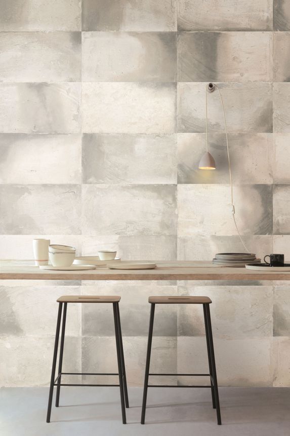 Vlies-Fototapete, Fliesenimitat in Grau- und Grau-Beige-Tönen.