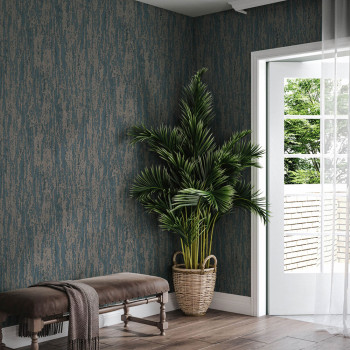 Luxuriöse Vliestapete mit Vinyloberfläche und ausgeprägter Prägestruktur in Blau- und Braungrau-Tönen.