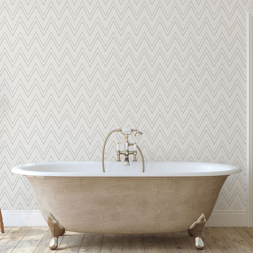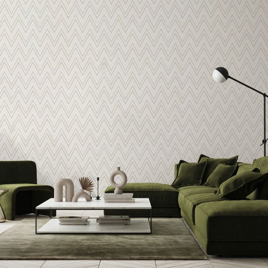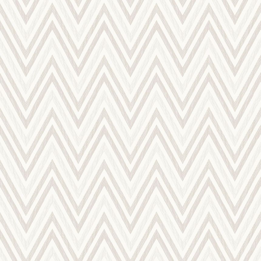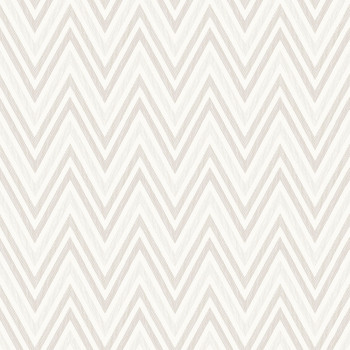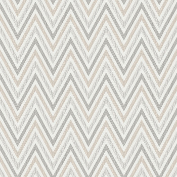 Vliestapete mit Vinyloberfläche, Zickzack-Muster in Weiß-, Beige- und Silbergrau-Tönen.