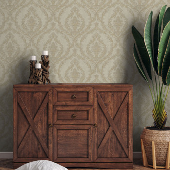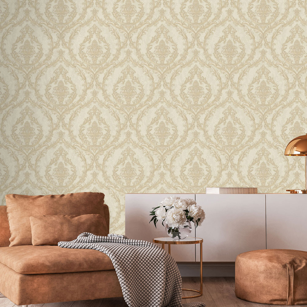 Luxuriöse beige Vliestapete, Barockmuster mit kleinem Glitzer.