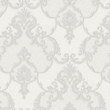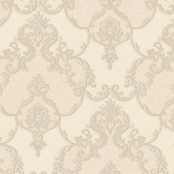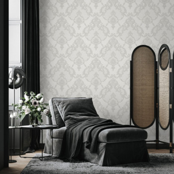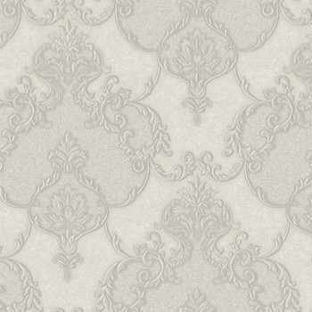 Luxuriöse grau-cremefarbene Vliestapete, Barockmuster mit Halbglanz, kleinem Silberglitzer.